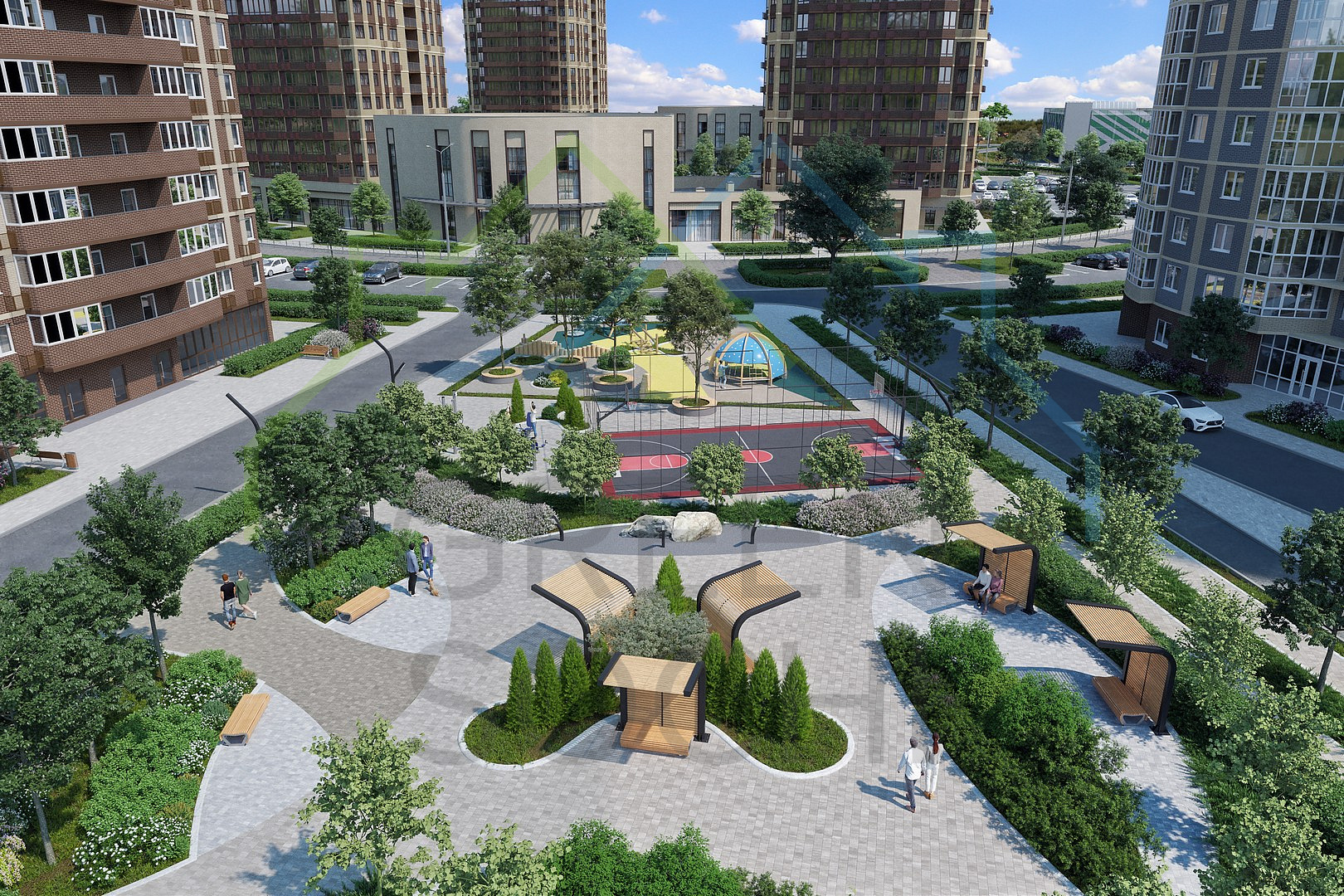Придомовая территория предполагает просторные дворы с качественным пышным озеленением с автоматическим поливом, безопасными детскими, спортивными площадками, зонами отдыха для людей любого возраста. Уютные улочки, зеленые скверы, спортивные центры. Много взрослых деревьев и малоэтажных домов. Место для здоровой размеренной жизни.